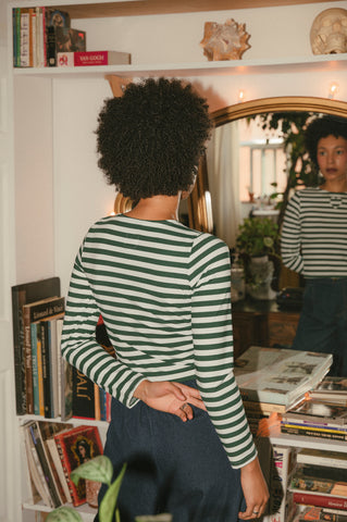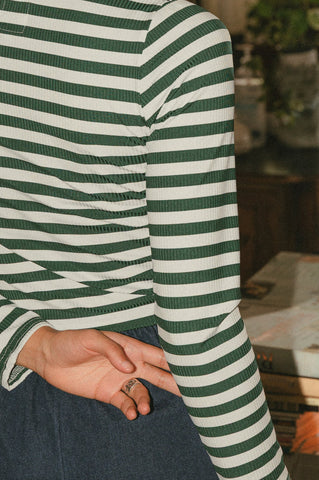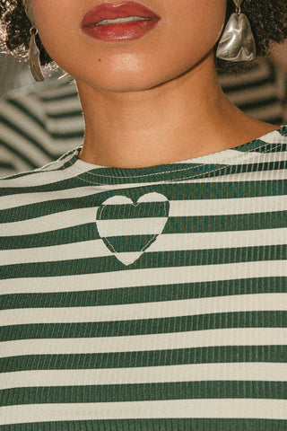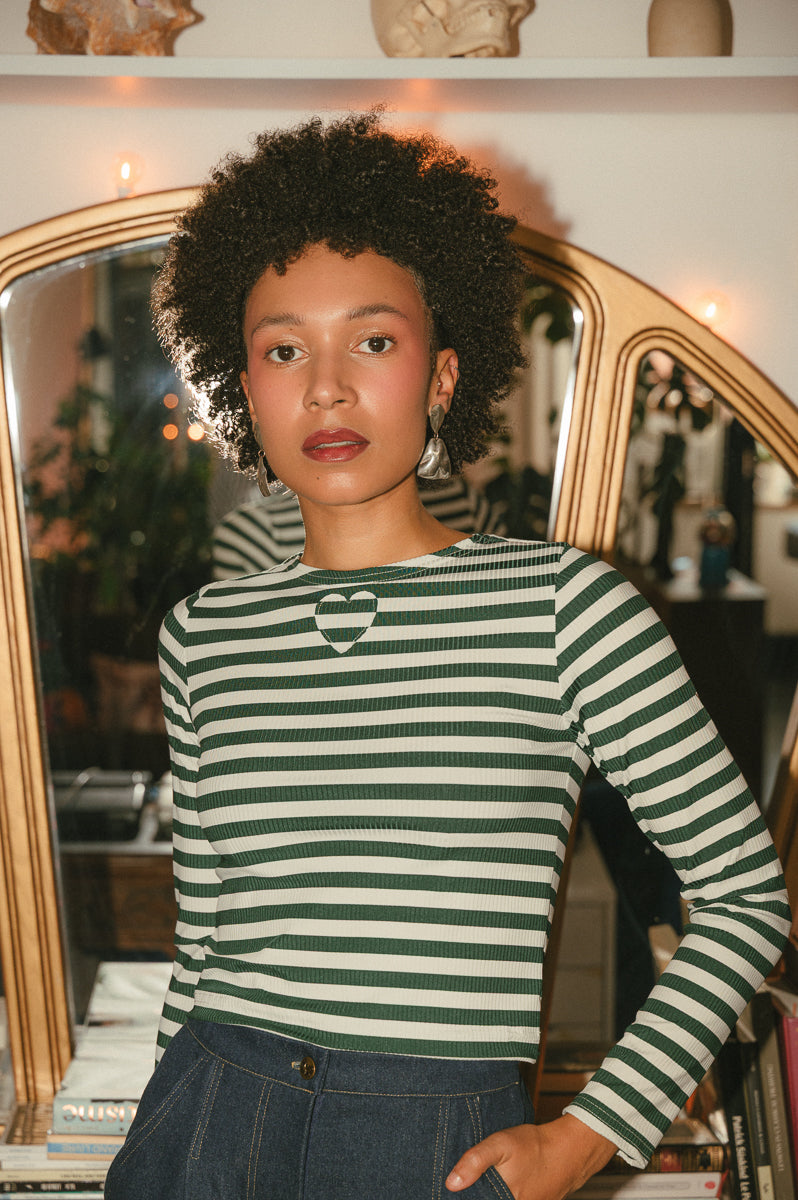 Ce chandail est un must à avoir dans votre garde-robe. Rib de qualité à rayures fond crème. Coeur appliqué sur la poitrine.