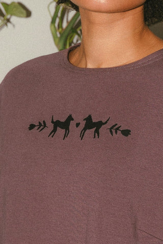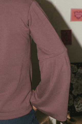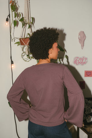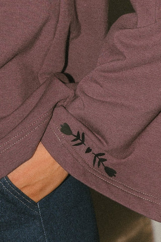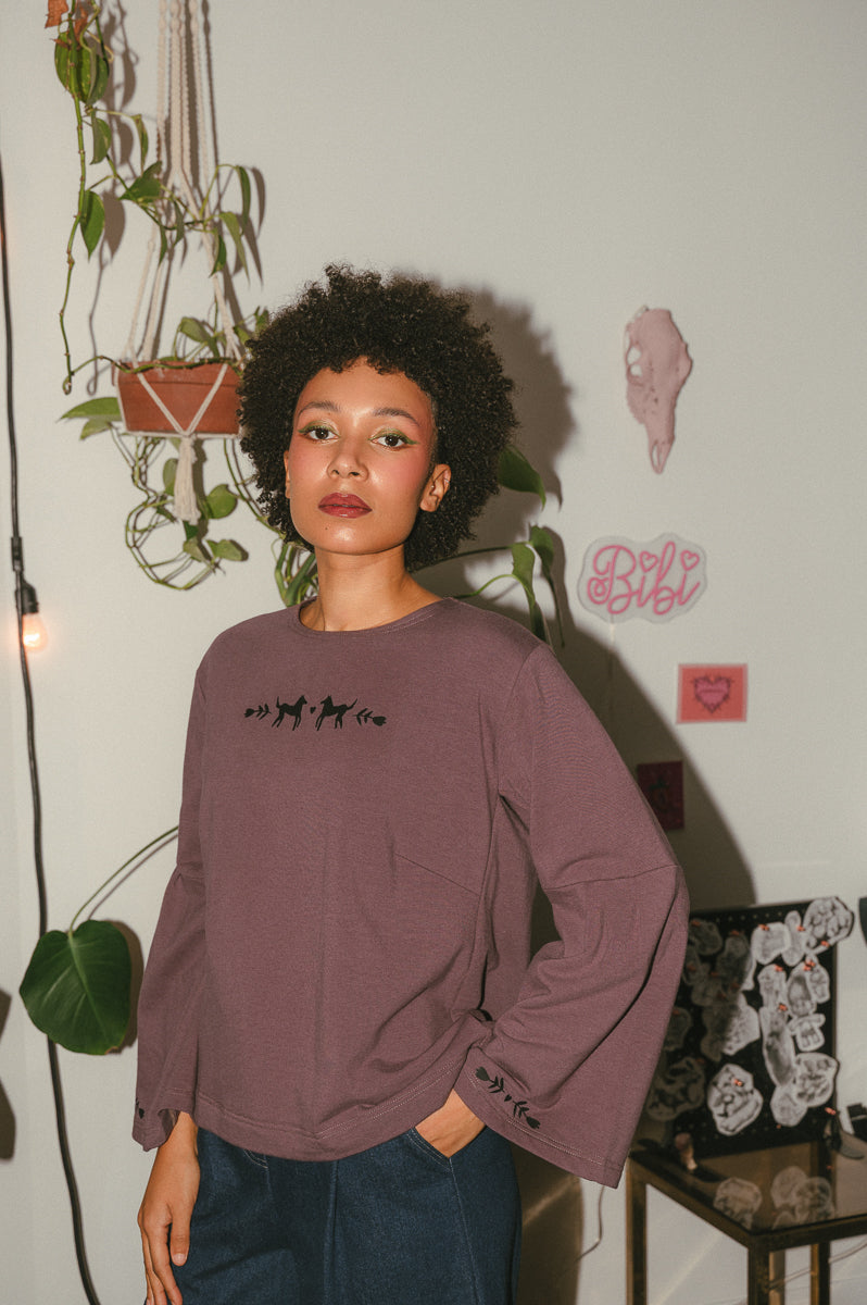 Le Winnie est confectionné avec le ouaté de bambou tellement confortable. Imprimés sur la poitrine et sur les manches faits à partir de mes croquis. Imprimés noirs sur un ouaté mauve magnifique. Manches cloches imprimées, pince poitrine et encore ronde.