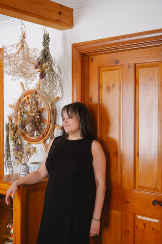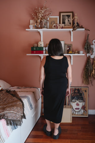 La robe bambou est ajustée, elle a de larges rebords sur les emmanchures et l'encolure. Elle est offerte en noire et en brun car ce sont les deux couleurs opaques dans le jersey de bambou utilisé.