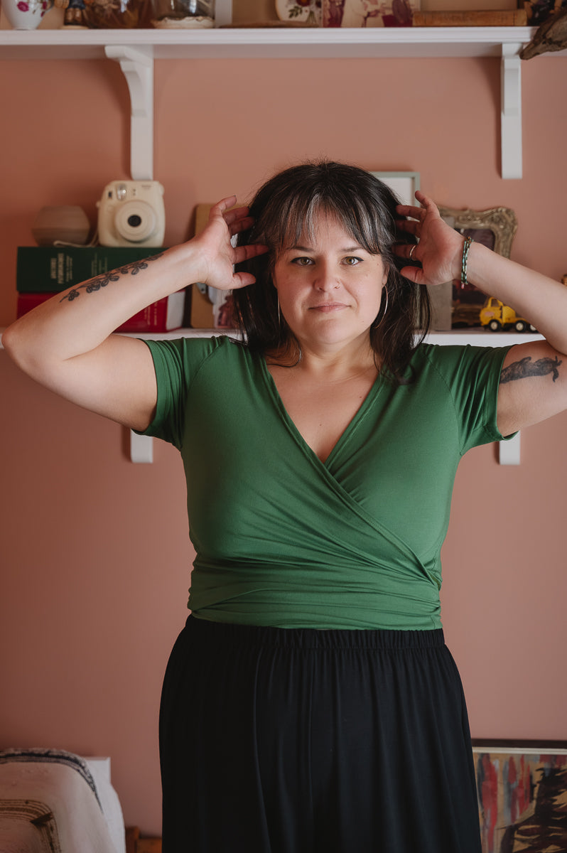 Le chandail wrap en bambou fait partie de la collection les essentiels, il est offert en plusieurs couleurs.